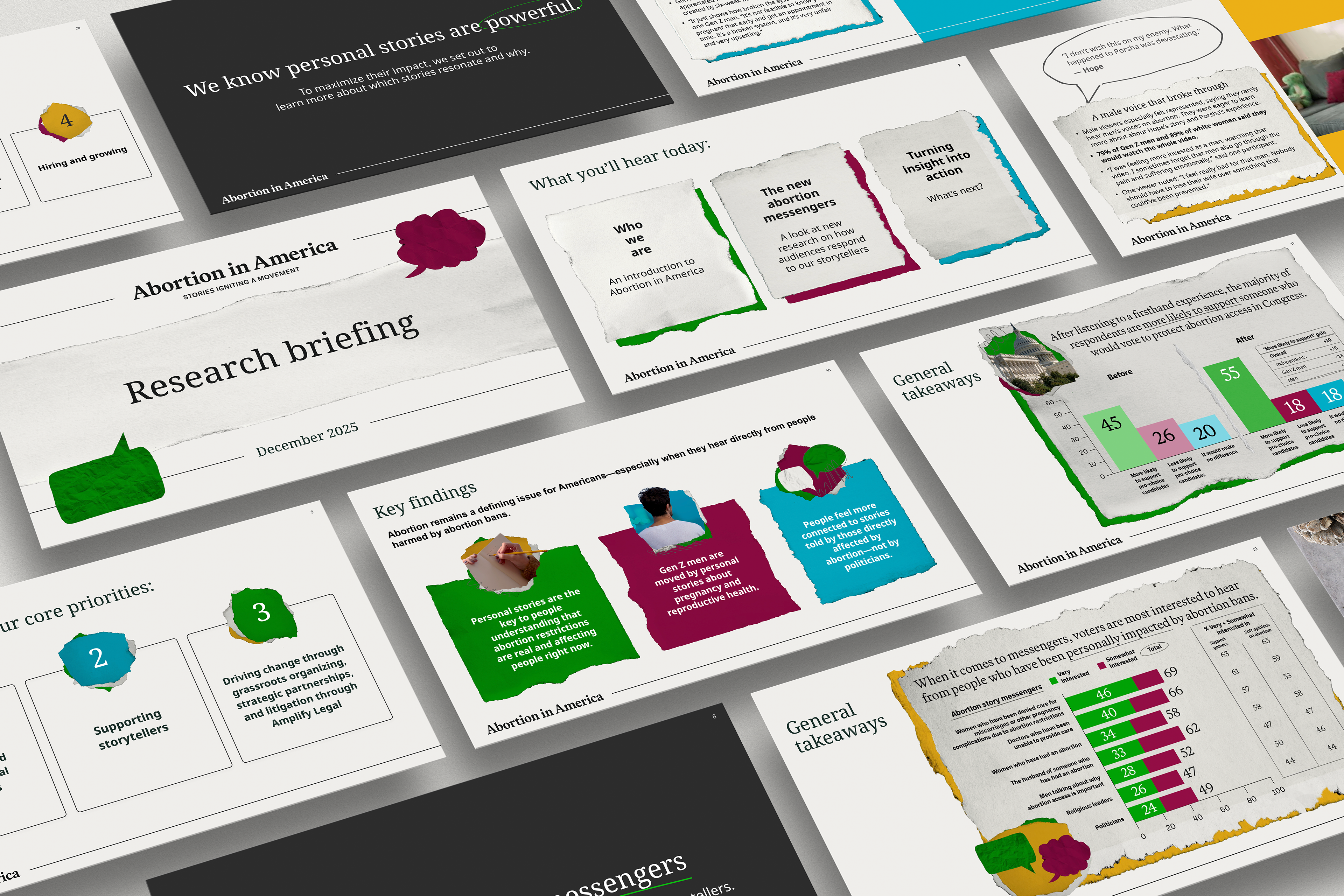 The new abortion messengers have the power to shift perspectives. Our mission was to help Abortion in America roll out its 2025 research findings, which show that personal stories can meaningfully reframe how people think about abortion. The goal was to translate this data into clear, persuasive materials, including a branded web page, a report deck, donor briefing materials, and digital content.